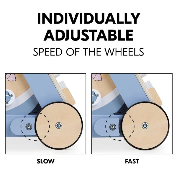 Die Geschwindigkeit der Räder kann individuell eingestellt werden, um die Lauflernhilfe an die Fortschritte deines Babys anzupassen. Die beiden seitlichen Bremsen können festgeschraubt werden, um die Geschwindigkeit zu Beginn zu reduzieren. Wenn dein Baby sicherer läuft, können die Bremsen entsprechend angepasst werden.