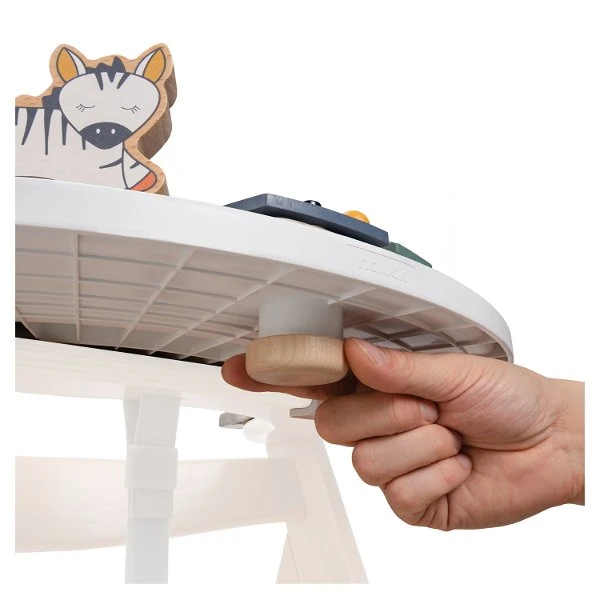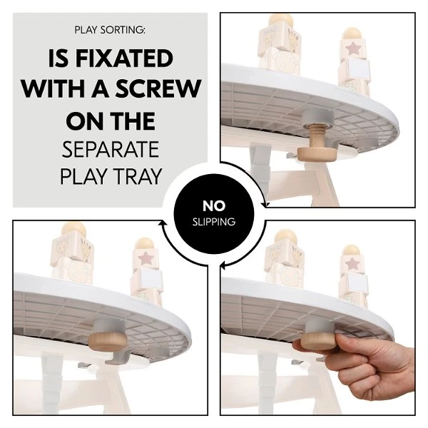 Das Spiel kannst du mit der mitgelieferten Holzschraube am Play Tray befestigen, sodass beim Spielen nichts verrutscht oder auf den Boden fällt. Das Play Tray ist schnell am Hochstuhl angeklickt. Alternativ kannst du das Sortierspiel auch ohne das Play Tray nutzen und mit zu Freunden, Familie oder in den Urlaub nehmen. Es eignet sich auch optimal als Geschenk für Mädchen und Jungen ab 18 Monaten.