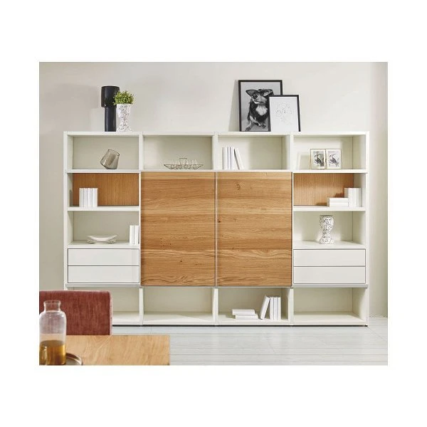 Die now! time by hülsta Kombination 7 in Natureiche/Lack-weiß ist eine Wohnwand mit Schiebetüren und Schubladen.