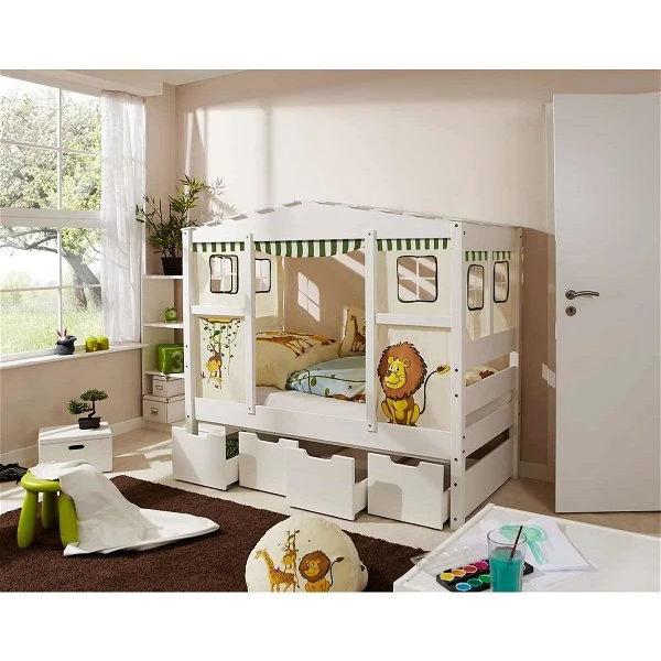 Ticaa Hausbett MINI Safari Kiefer Weiß inkl. Schubkästen – Dessin: Safari