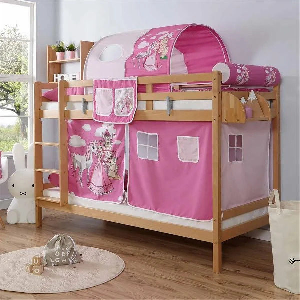 Das Ticaa Rene Etagenbett bietet einen sicheren Schlafplatz auf beiden Ebenen. Es ist aus massiven Buchenholz gefertigt und besitzt oben rundherum einen Fallschutz sowie eine Leiter.